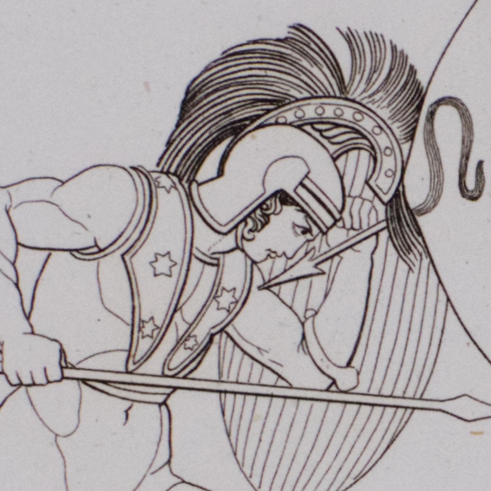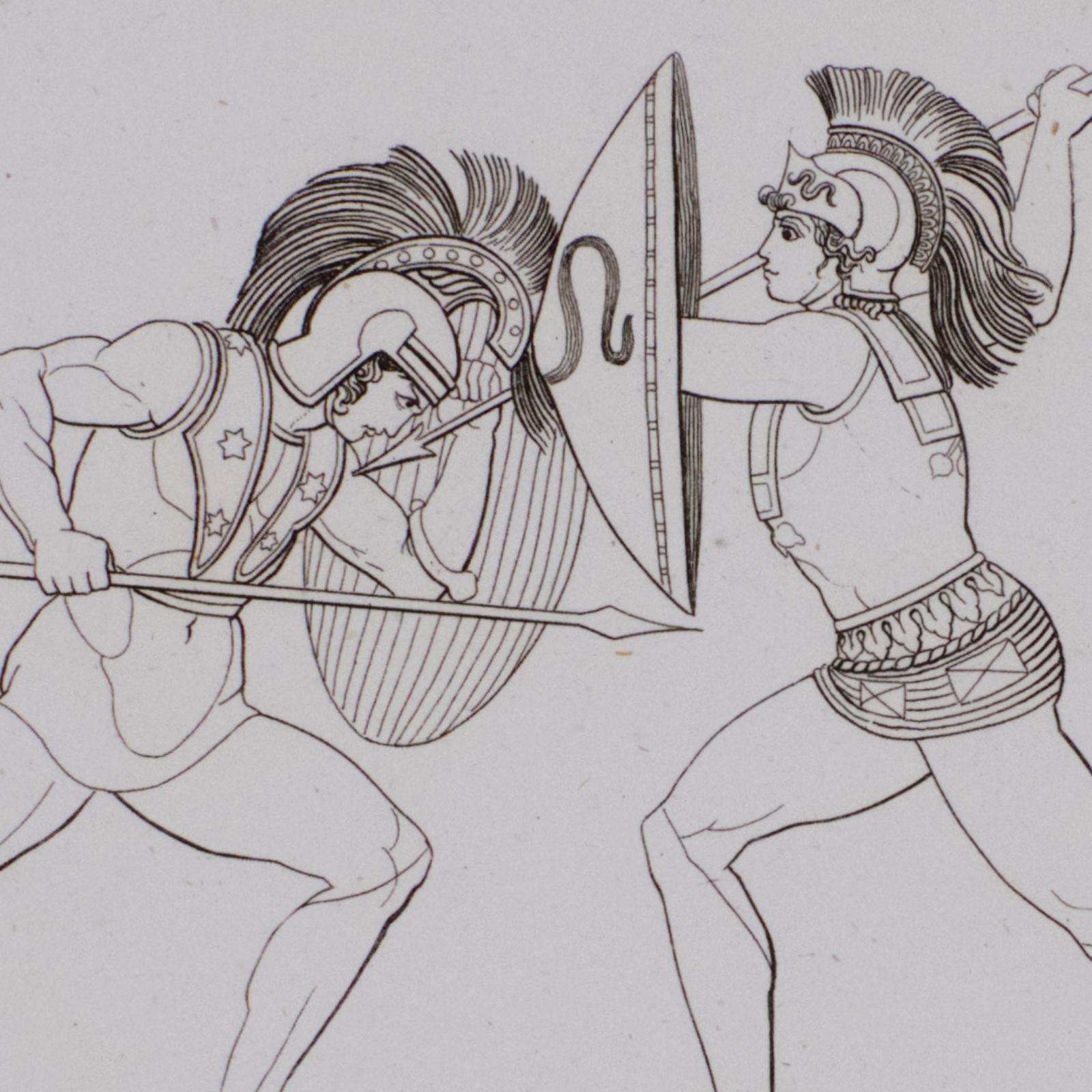 Grabado al contorno, Tragedías de Esquilo.Combate de Eteoclo y Polinice.