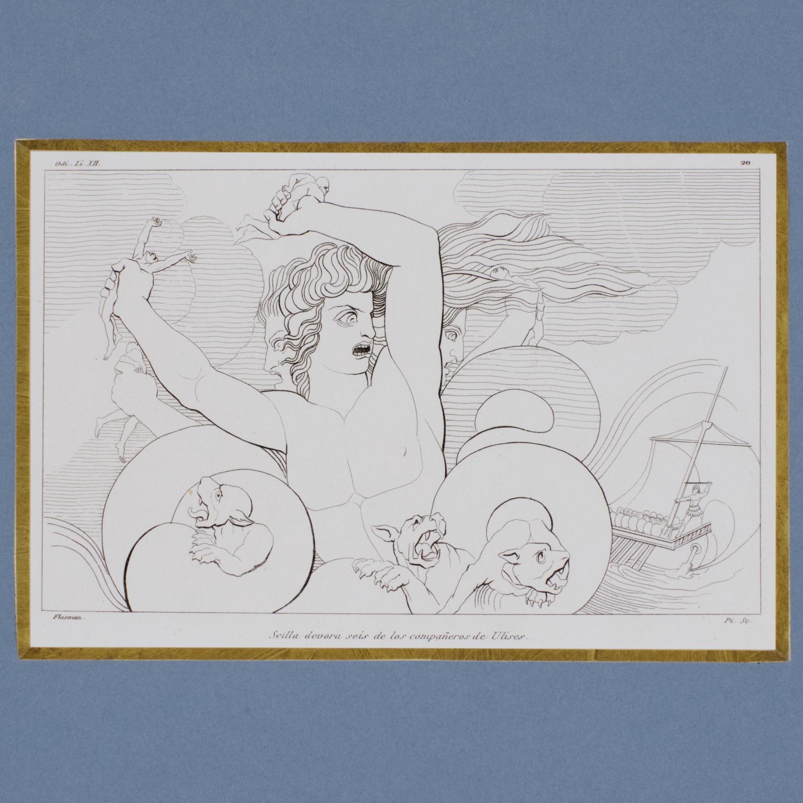 Grabado al contorno, Odisea de Homero. Seilla devora seis de los compañeros de Ulises.