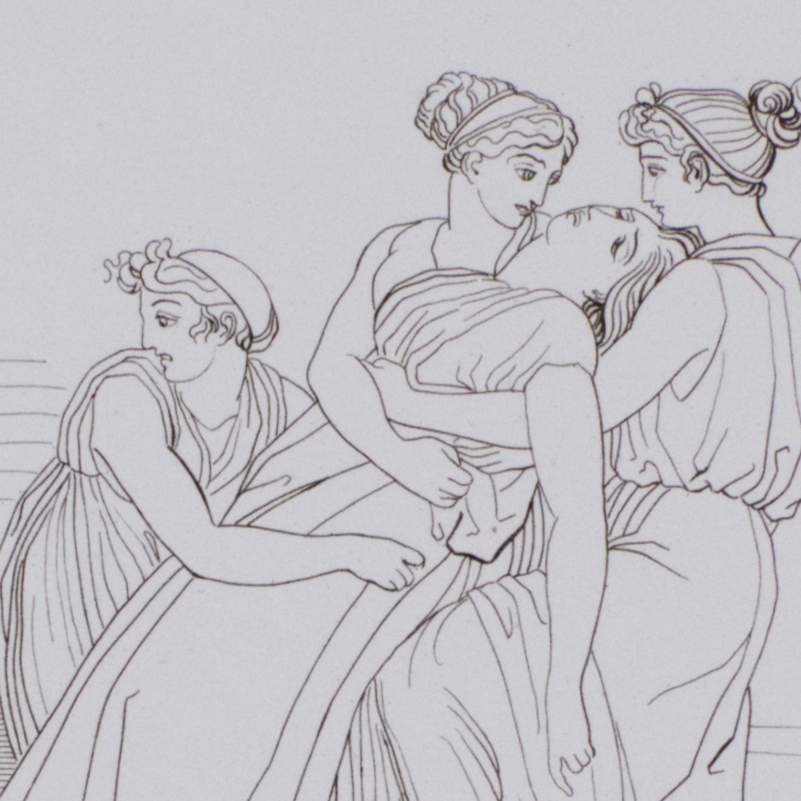 Grabado al contorno, La Iliada de Homero. Andromaca cae desfallecidaa la vista del cuerpo de Hector arrastrado por Arquiles alrededor de las murallas de Troya.